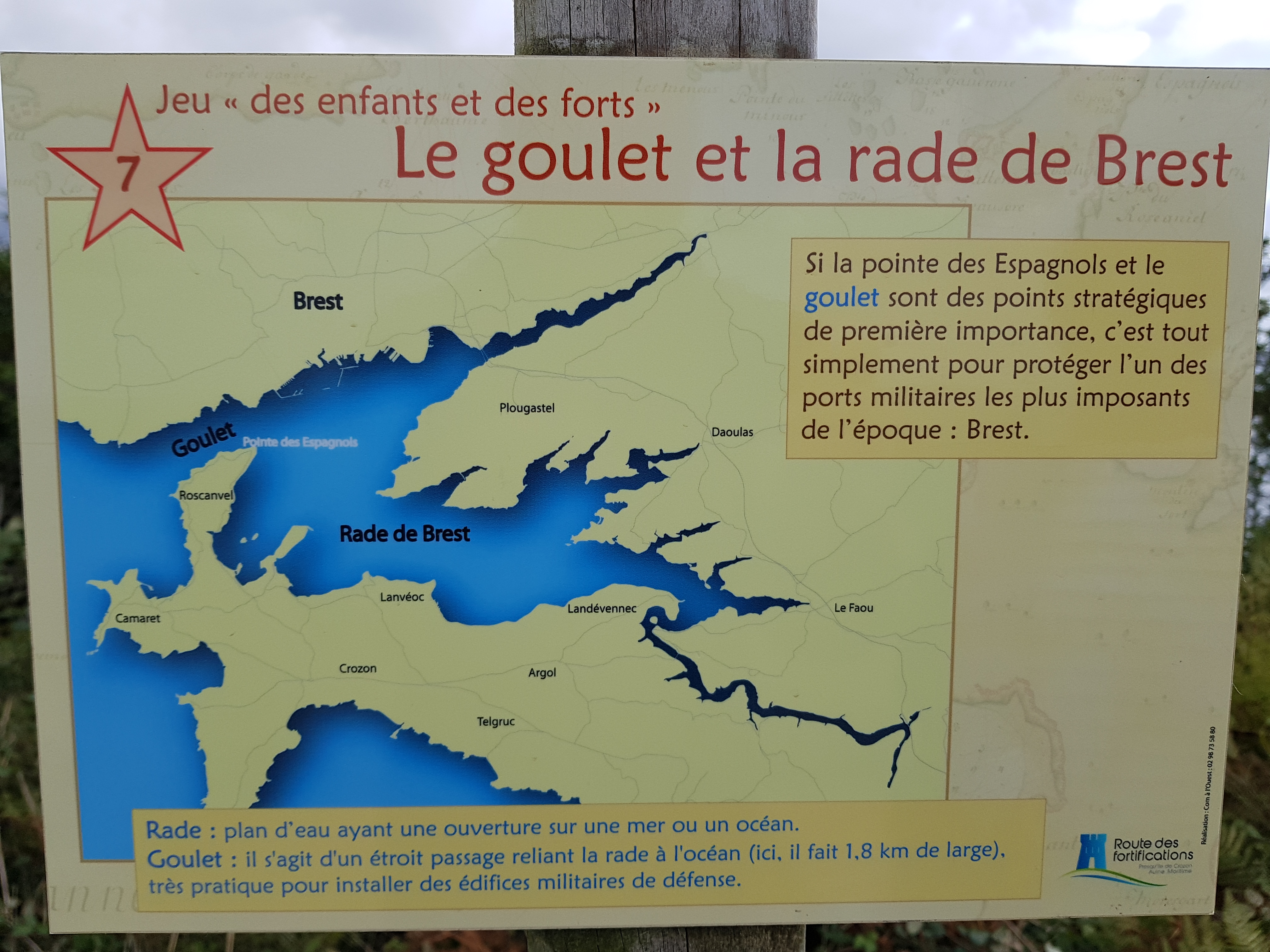 Histoire avec un beau point de vue sur l'estuaire maritime et Brest avec sa rade navale. De nombreux bunkers anciens et une vue sur les bunkers sous-marins de la Seconde Guerre mondiale. Petit parcours pédestre bien balisé et qui dure une quinzaine de minutes depuis le parking.