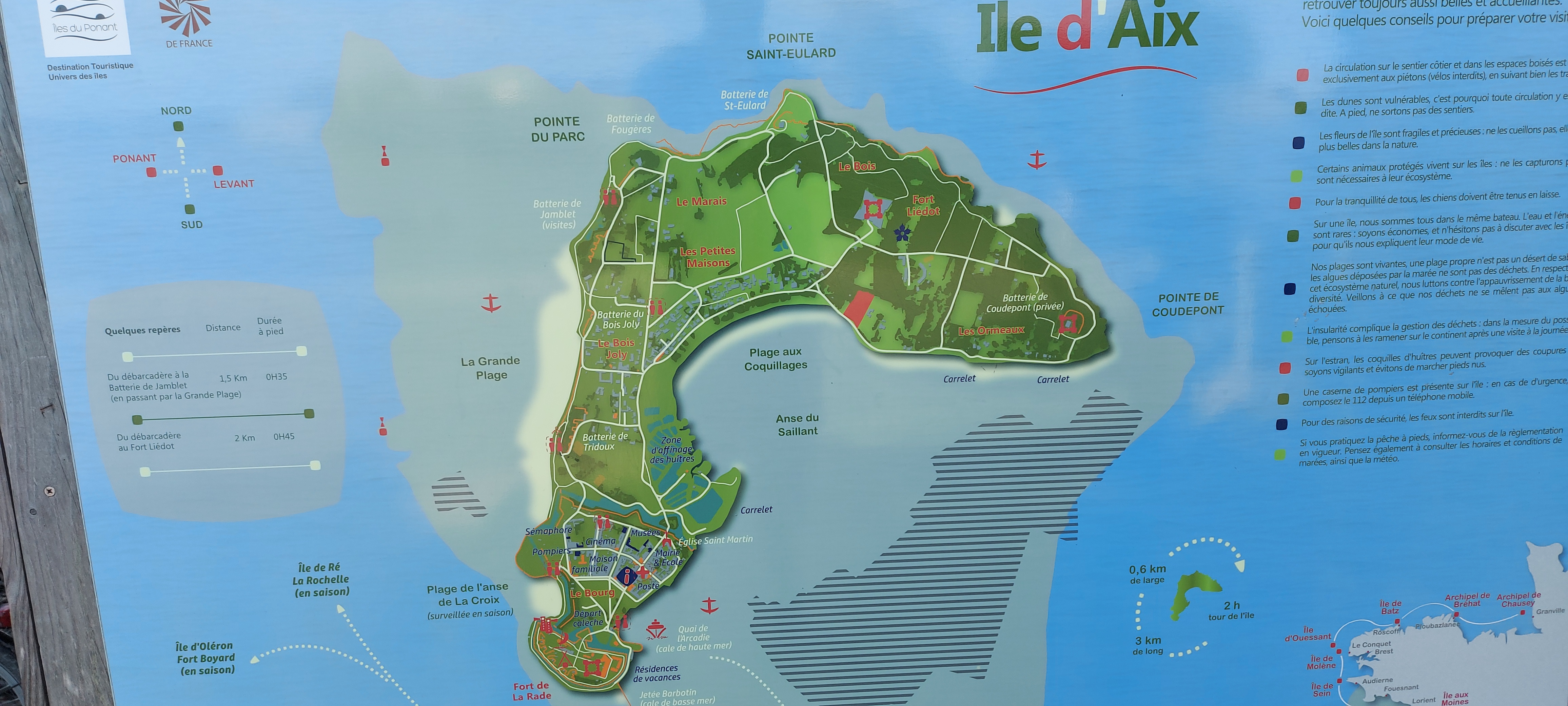 Île d'aix, petite île dont on peut faire le tour dans la journée, à pied ou à vélo. Entourée de petites batteries qui sont un objectif de balade.