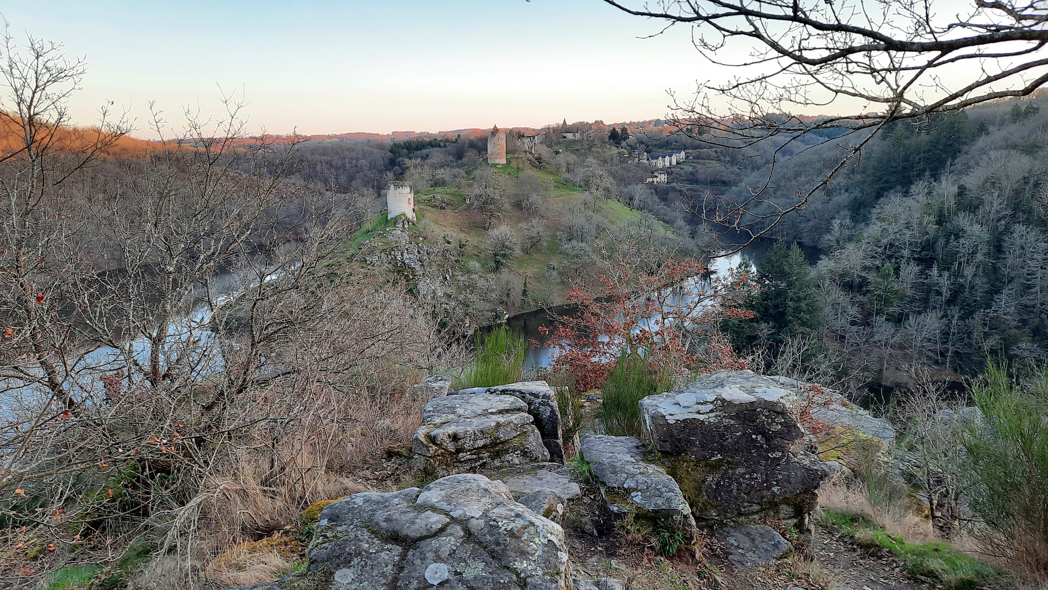 Sublime paysage du haut de ces tours, vestiges d'une forteresse médiévale, qui surplombent deux rivières confluentes, la Creuse et la Sedelle.